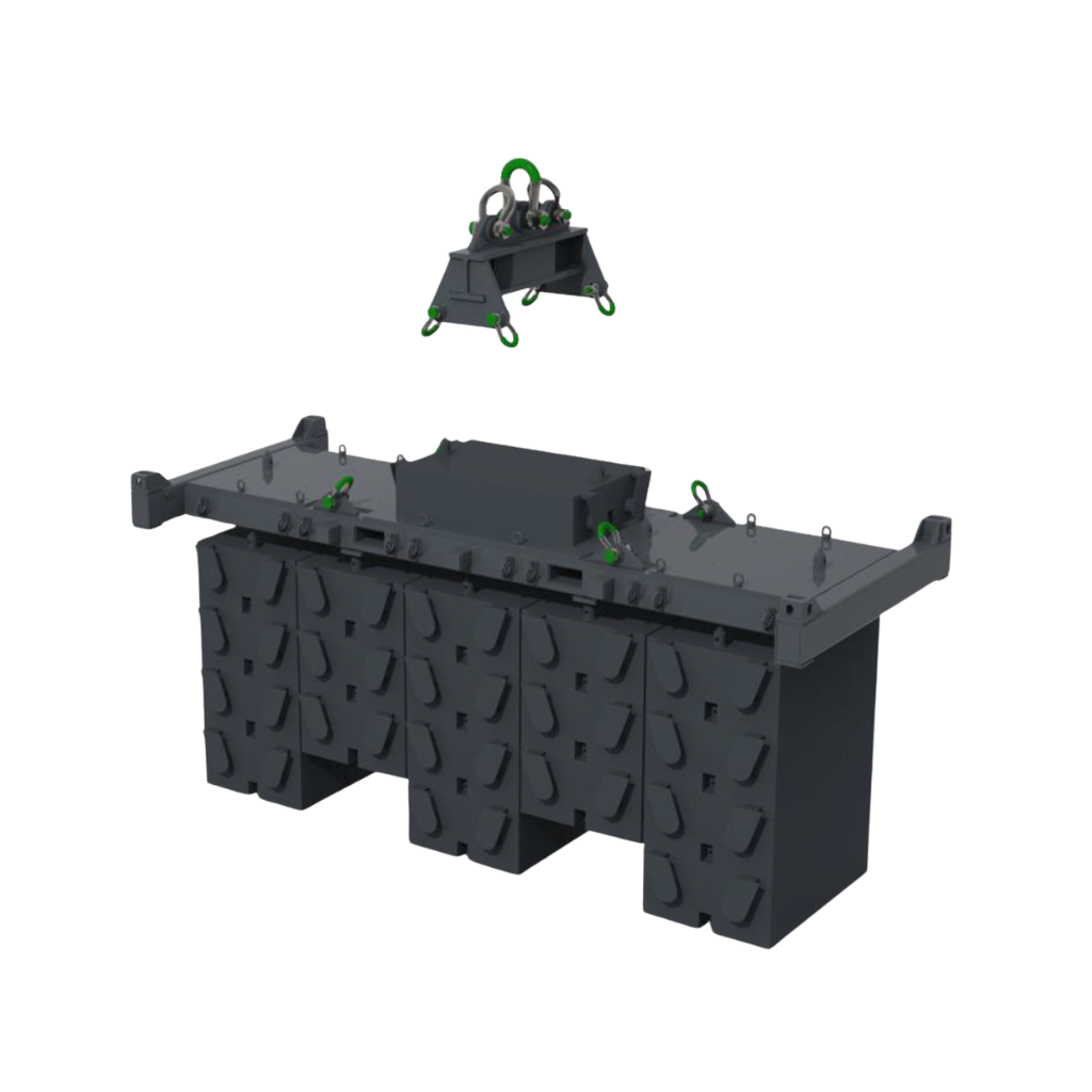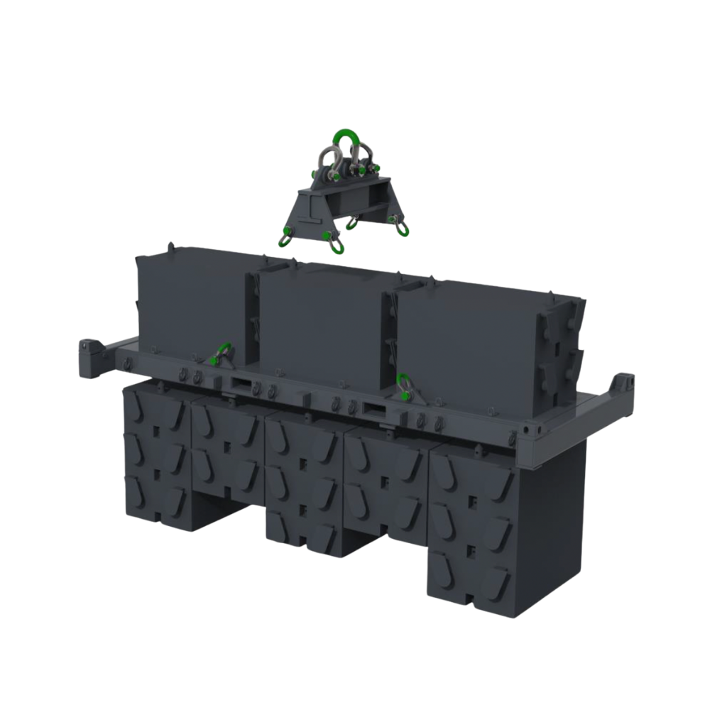 Dit hijsmiddel is op maat gemaakt voor de 5- en 3 tons testgewichten van Vermeer Rental & Services. Het gebruik van andere testgewichten is toegestaan mits de belasting juist verdeeld wordt, de W.L.L. en maximale tophoeken niet overschreden worden en de gewichten juist geborgd zijn.